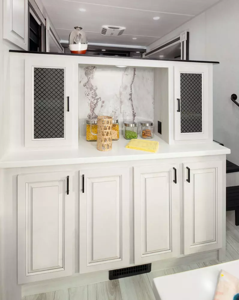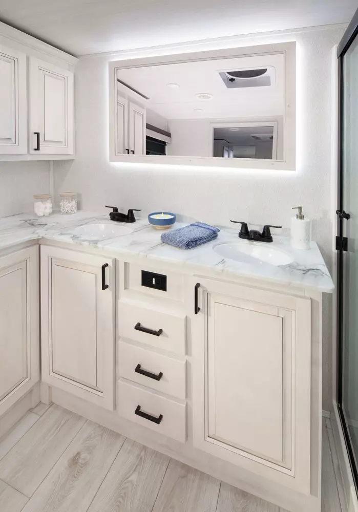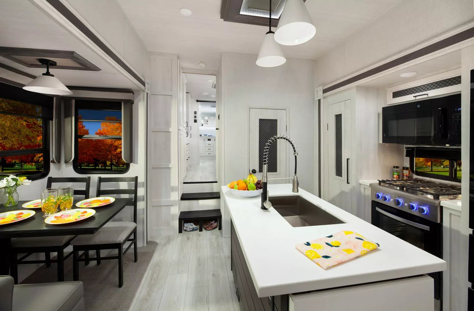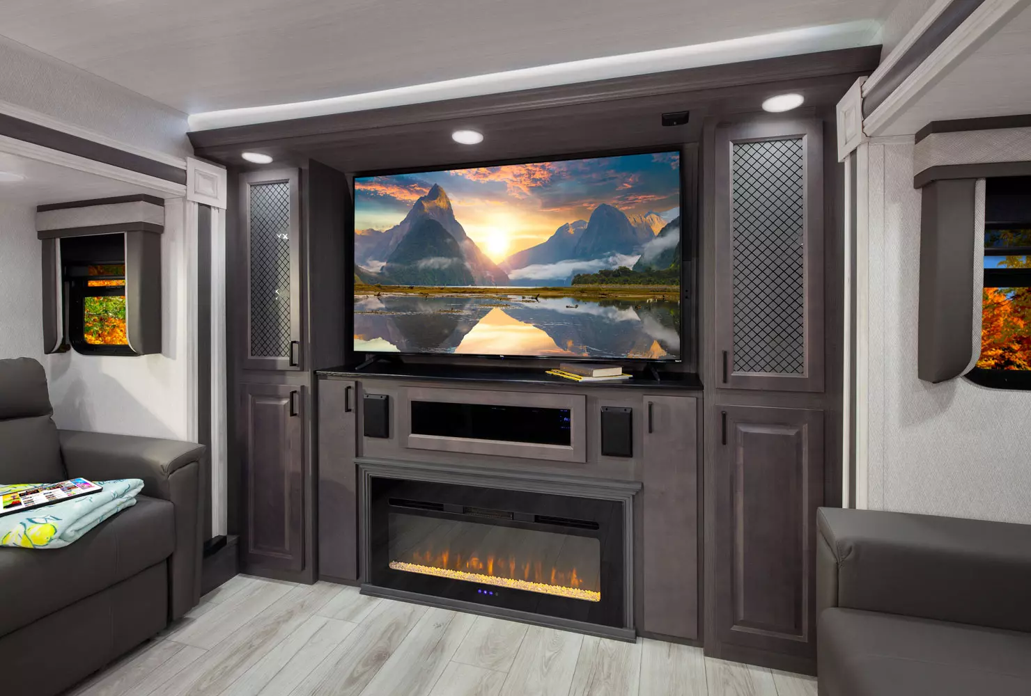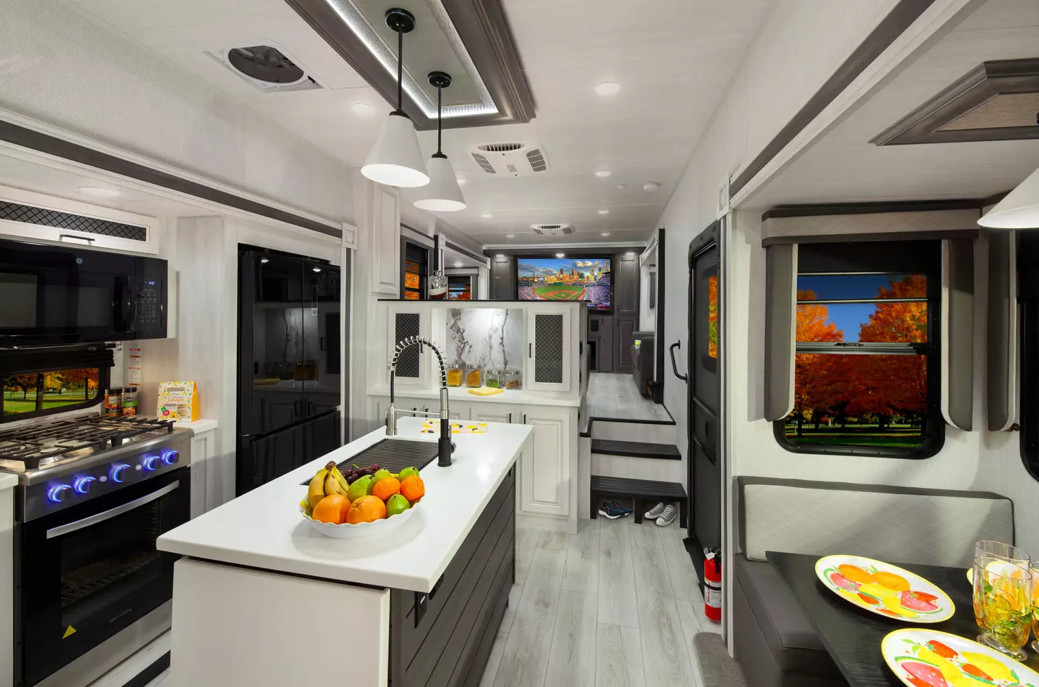 The 380FL has five slideouts and one entry. Exterior features pass through storage, universal docking station, MORryde steps, LP quick connect, 14 foot awning and 16 foot awning, and rear storage with sliding tray. Interior layout front to back: TV with fireplace, opposing hide-a-bed sofa slideouts, and theater seating across from TV; two steps down to kitchen and entry; hutch along inner wall; off-door side slideout with 12V refrigerator, microwave, residential-style oven, and pantry; island with sink and countertop extensions; door-side slideout with free-standing dinette; off-door side half bathroom; door side closet and two steps up to rear bedroom; off-door side king bed slideout with drawers under bed, and door side dresser w/TV; rear full bathroom with washer/dryer prep, dual sink, overhead cabinet, and shower with skylight.