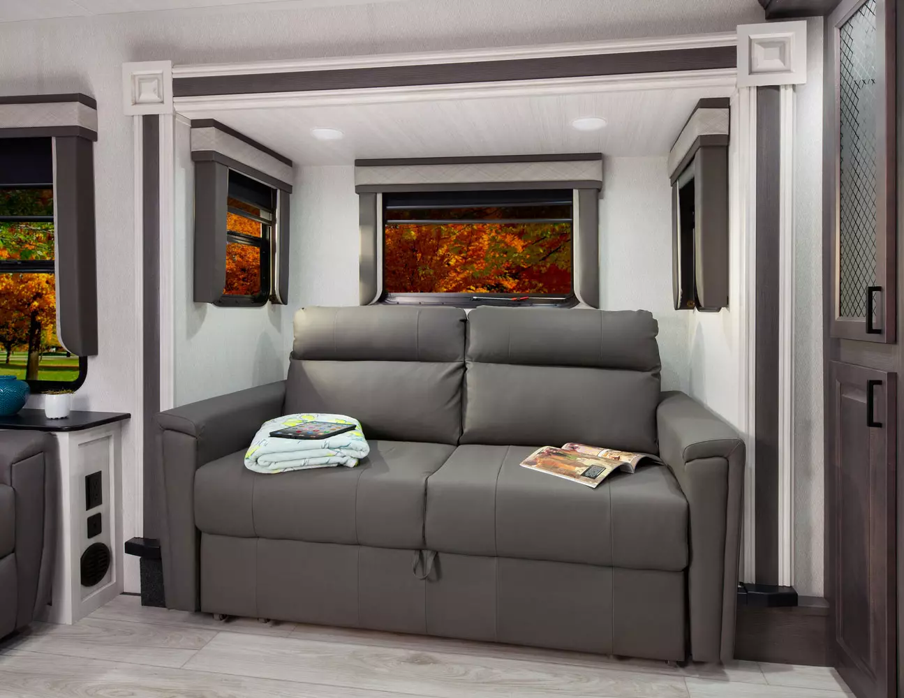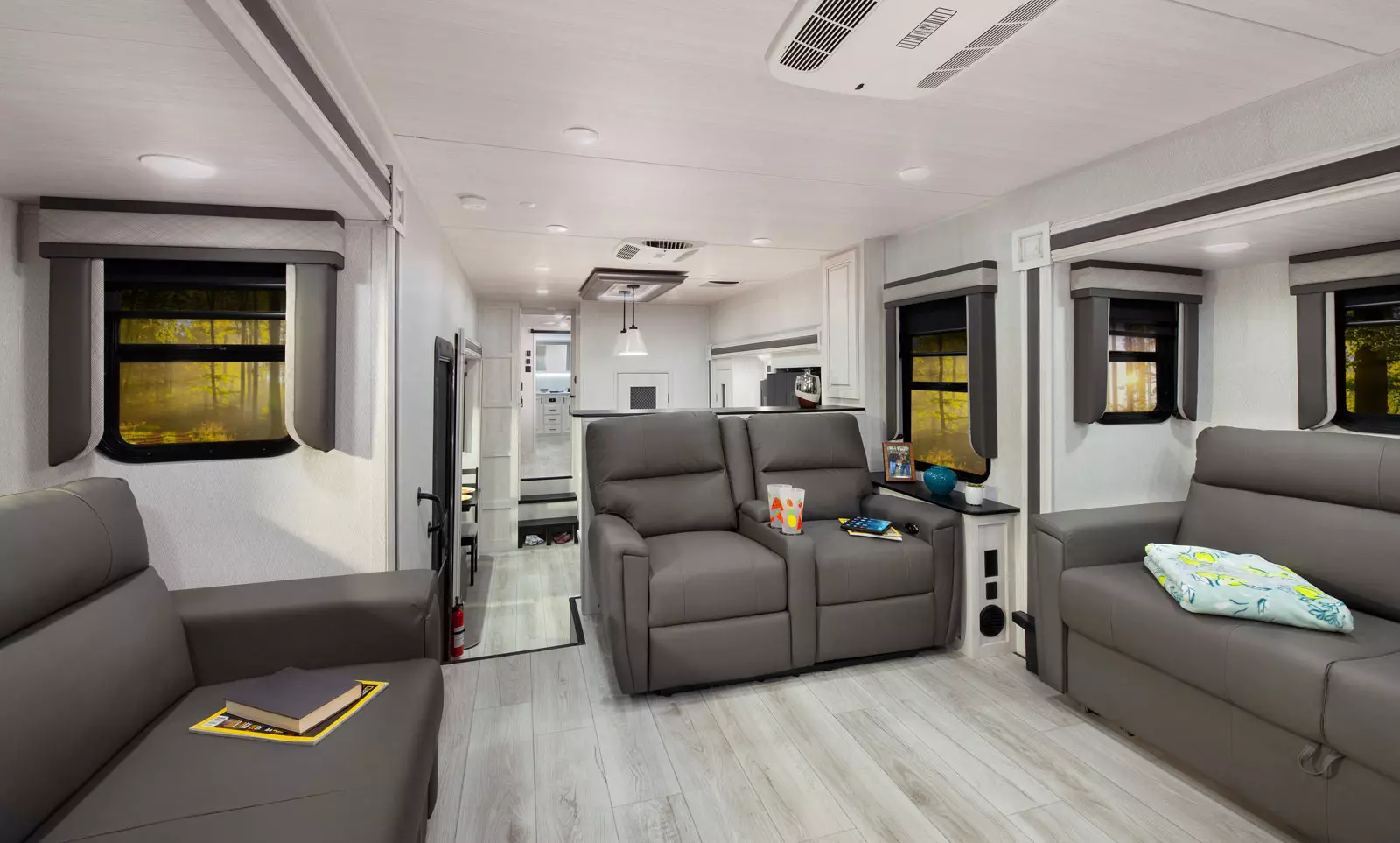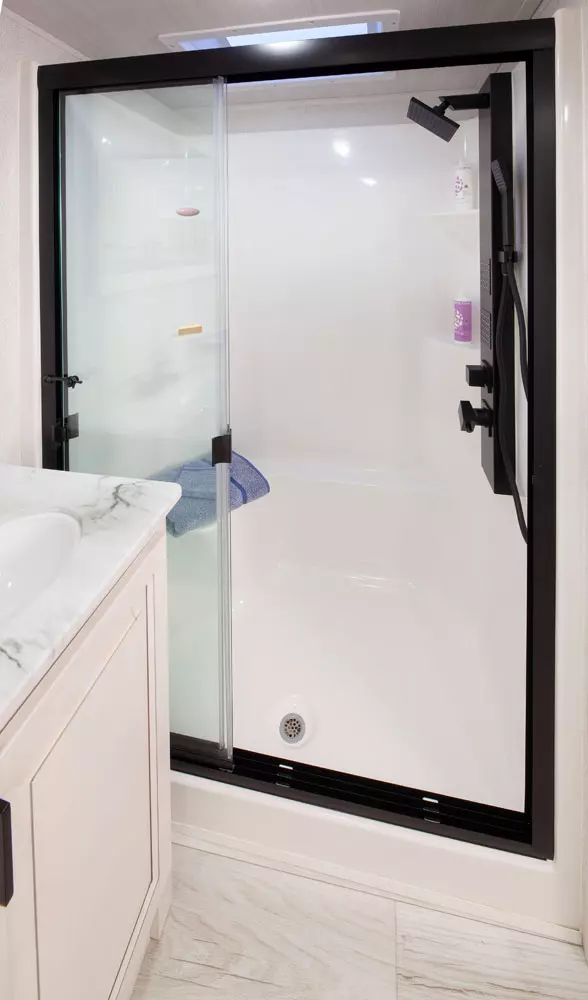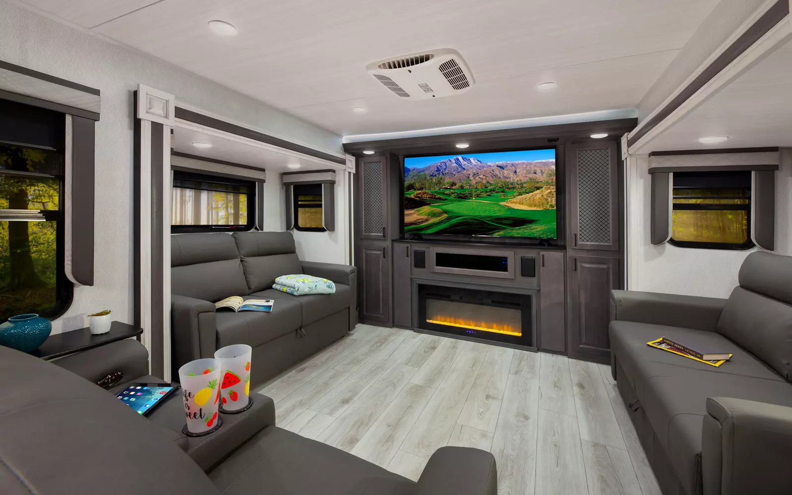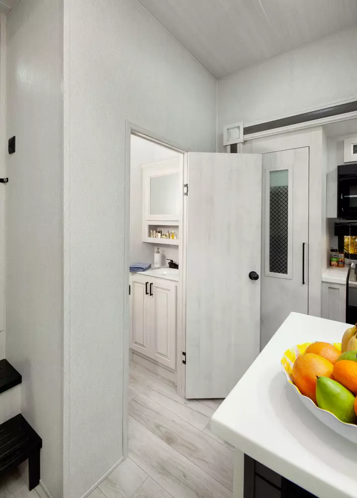 The 380FL has five slideouts and one entry. Exterior features pass through storage, universal docking station, MORryde steps, LP quick connect, 14 foot awning and 16 foot awning, and rear storage with sliding tray. Interior layout front to back: TV with fireplace, opposing hide-a-bed sofa slideouts, and theater seating across from TV; two steps down to kitchen and entry; hutch along inner wall; off-door side slideout with 12V refrigerator, microwave, residential-style oven, and pantry; island with sink and countertop extensions; door-side slideout with free-standing dinette; off-door side half bathroom; door side closet and two steps up to rear bedroom; off-door side king bed slideout with drawers under bed, and door side dresser w/TV; rear full bathroom with washer/dryer prep, dual sink, overhead cabinet, and shower with skylight.