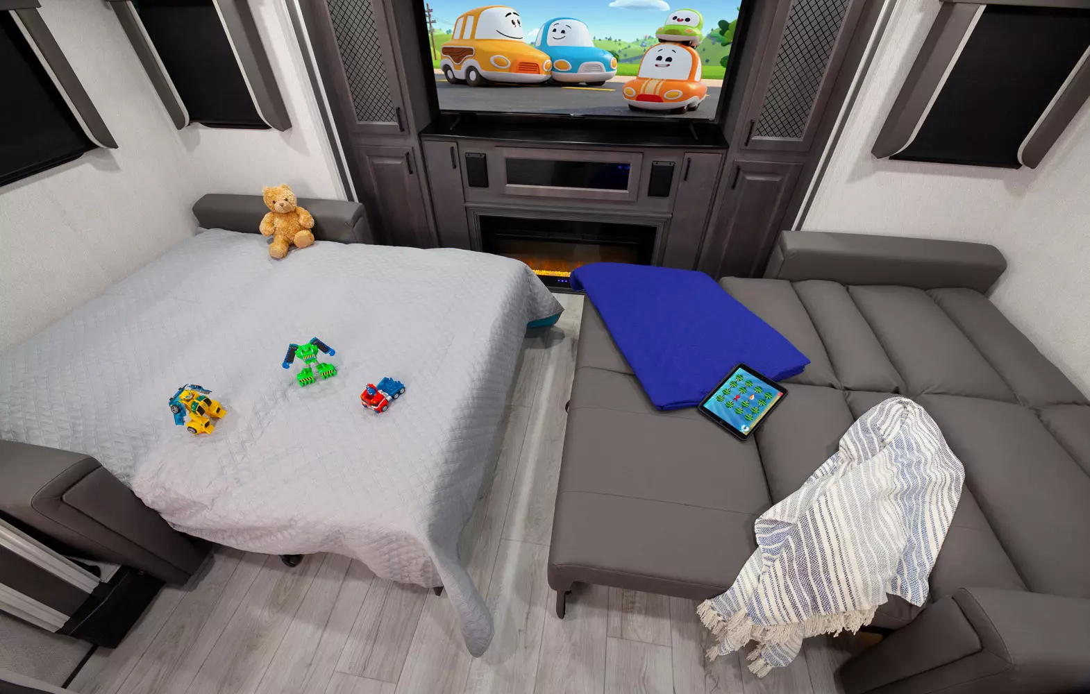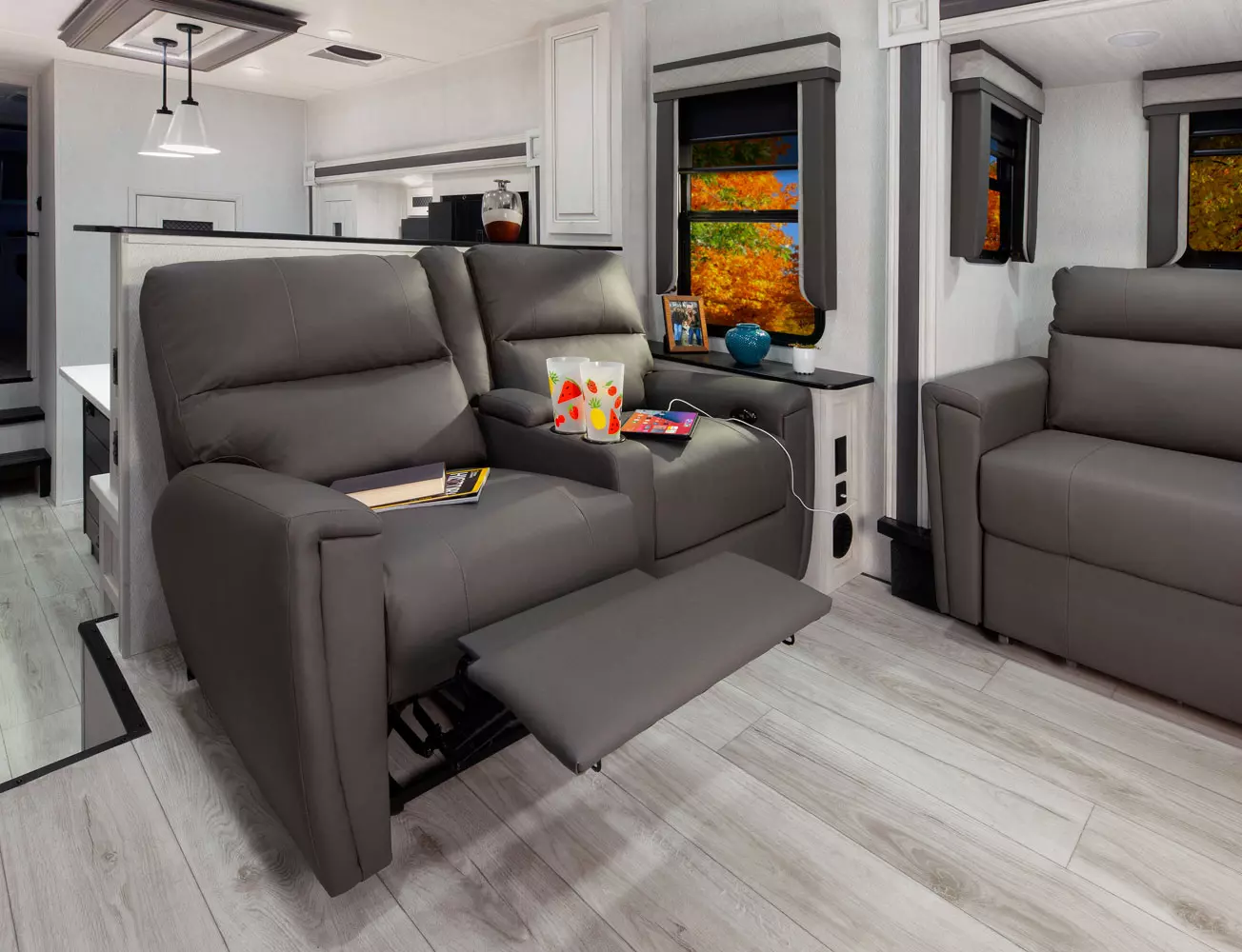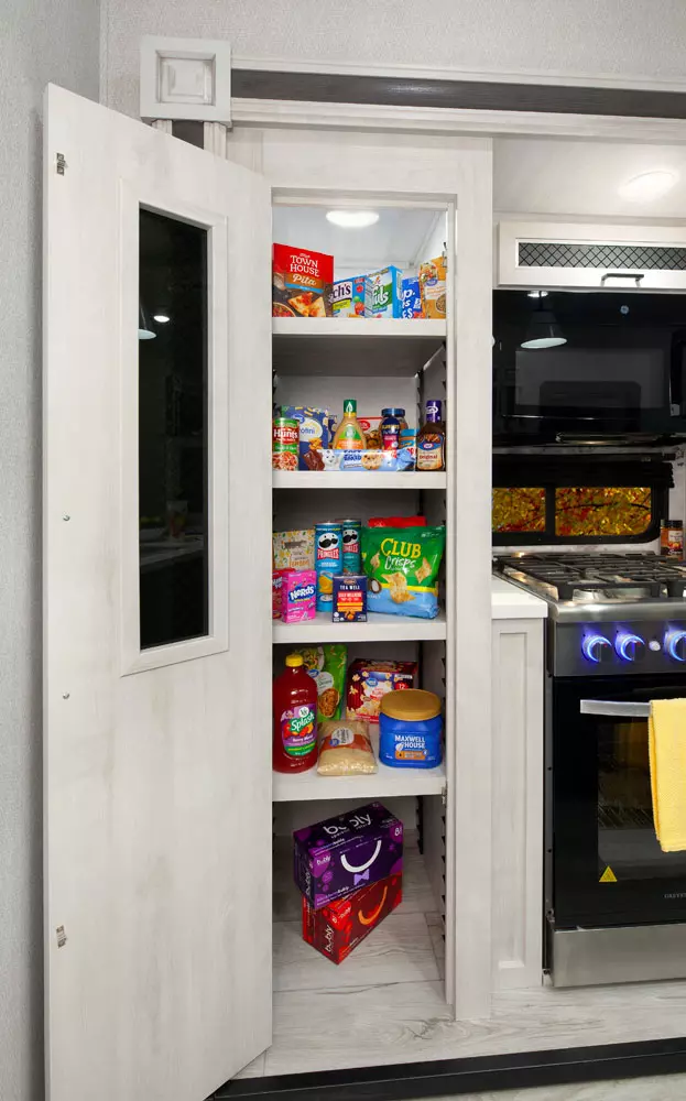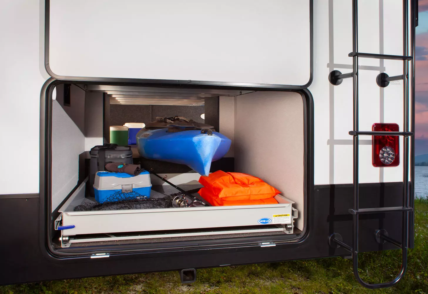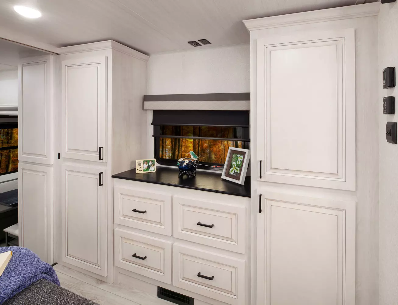 The 380FL has five slideouts and one entry. Exterior features pass through storage, universal docking station, MORryde steps, LP quick connect, 14 foot awning and 16 foot awning, and rear storage with sliding tray. Interior layout front to back: TV with fireplace, opposing hide-a-bed sofa slideouts, and theater seating across from TV; two steps down to kitchen and entry; hutch along inner wall; off-door side slideout with 12V refrigerator, microwave, residential-style oven, and pantry; island with sink and countertop extensions; door-side slideout with free-standing dinette; off-door side half bathroom; door side closet and two steps up to rear bedroom; off-door side king bed slideout with drawers under bed, and door side dresser w/TV; rear full bathroom with washer/dryer prep, dual sink, overhead cabinet, and shower with skylight.