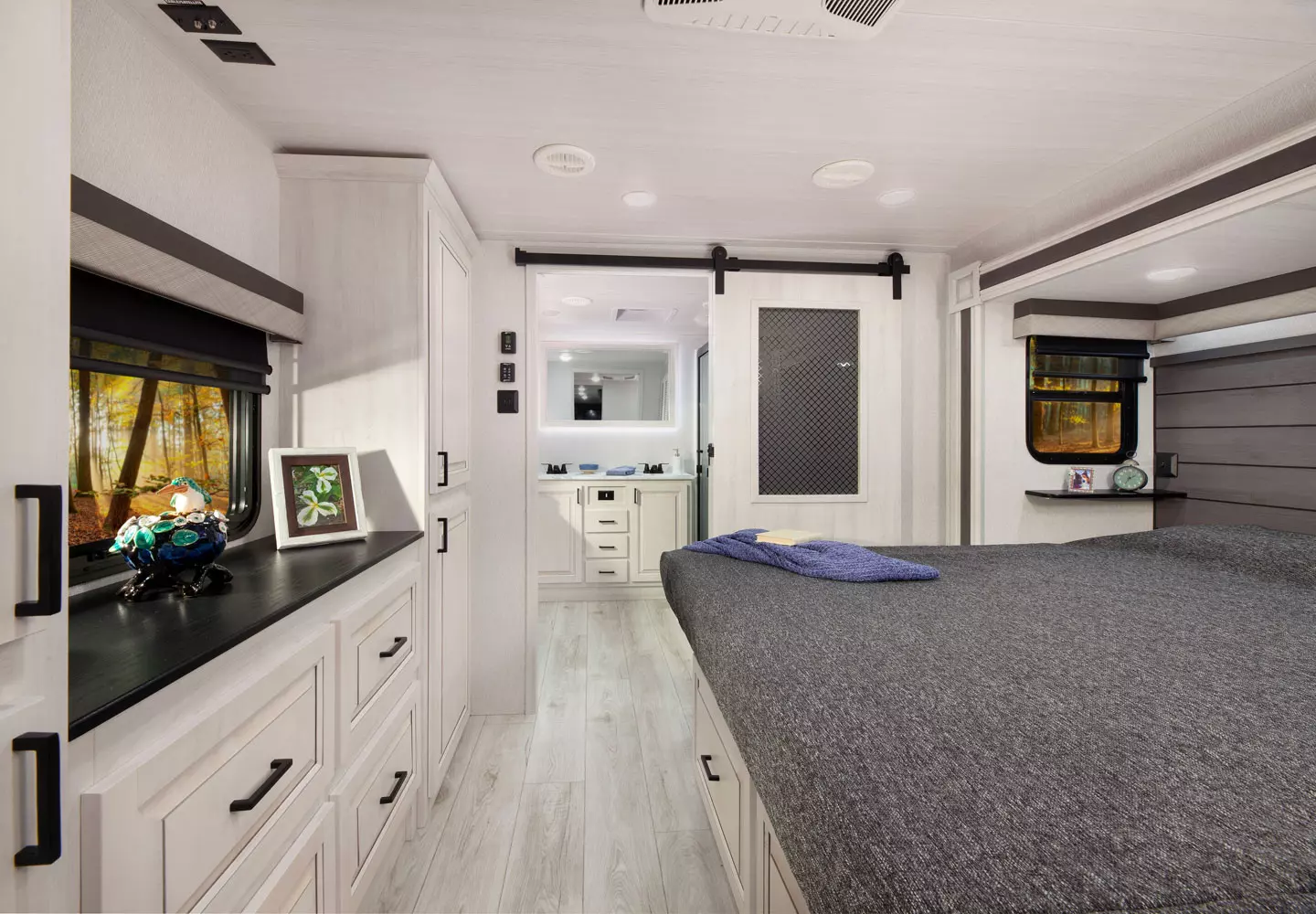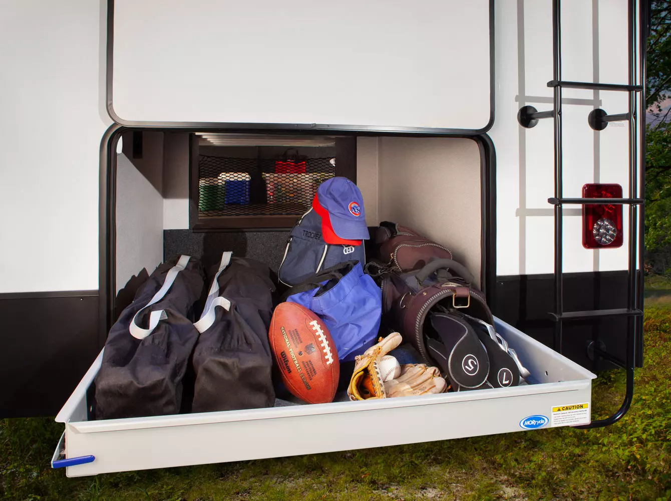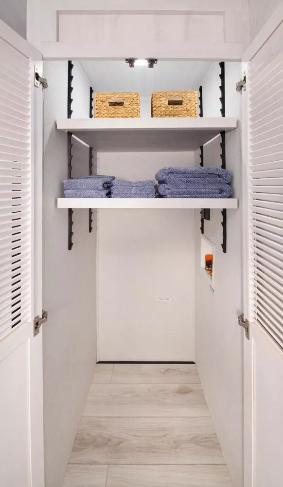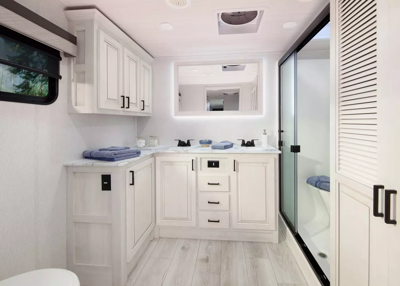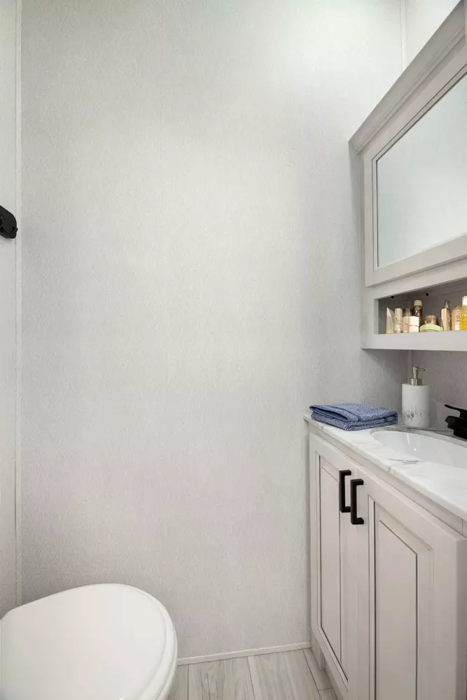 The 380FL has five slideouts and one entry. Exterior features pass through storage, universal docking station, MORryde steps, LP quick connect, 14 foot awning and 16 foot awning, and rear storage with sliding tray. Interior layout front to back: TV with fireplace, opposing hide-a-bed sofa slideouts, and theater seating across from TV; two steps down to kitchen and entry; hutch along inner wall; off-door side slideout with 12V refrigerator, microwave, residential-style oven, and pantry; island with sink and countertop extensions; door-side slideout with free-standing dinette; off-door side half bathroom; door side closet and two steps up to rear bedroom; off-door side king bed slideout with drawers under bed, and door side dresser w/TV; rear full bathroom with washer/dryer prep, dual sink, overhead cabinet, and shower with skylight.