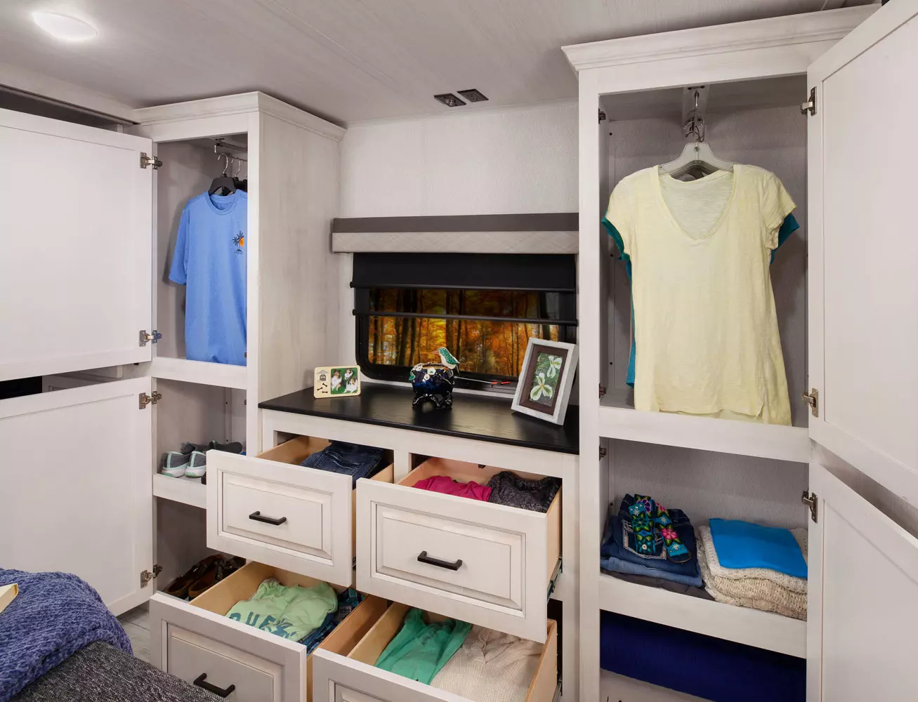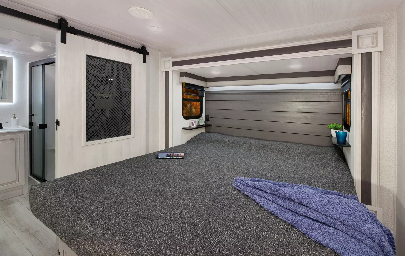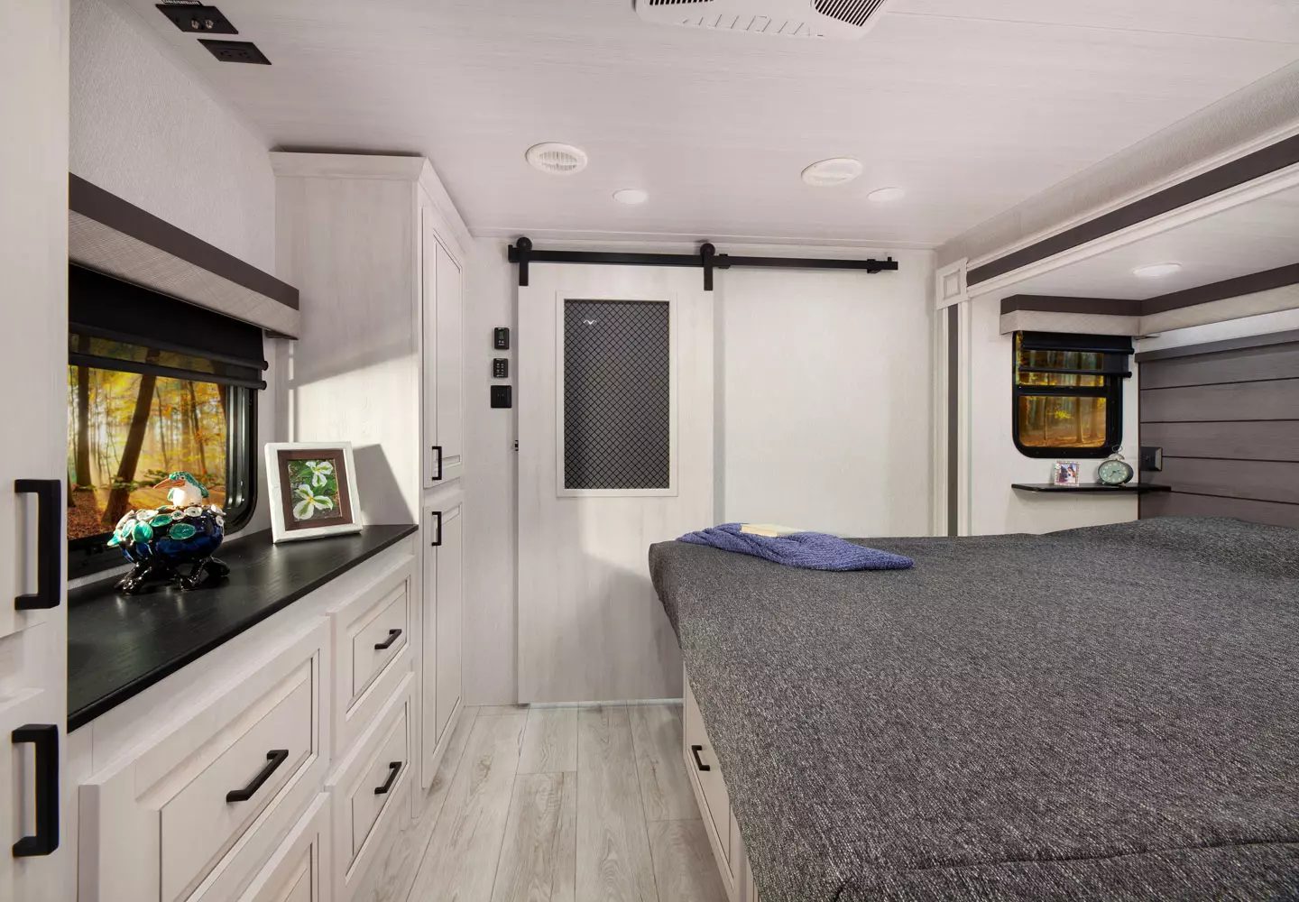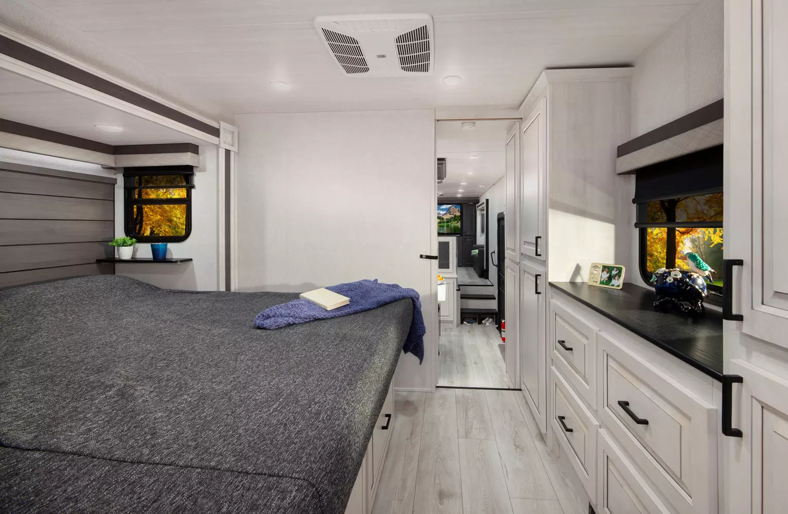 The 380FL has five slideouts and one entry. Exterior features pass through storage, universal docking station, MORryde steps, LP quick connect, 14 foot awning and 16 foot awning, and rear storage with sliding tray. Interior layout front to back: TV with fireplace, opposing hide-a-bed sofa slideouts, and theater seating across from TV; two steps down to kitchen and entry; hutch along inner wall; off-door side slideout with 12V refrigerator, microwave, residential-style oven, and pantry; island with sink and countertop extensions; door-side slideout with free-standing dinette; off-door side half bathroom; door side closet and two steps up to rear bedroom; off-door side king bed slideout with drawers under bed, and door side dresser w/TV; rear full bathroom with washer/dryer prep, dual sink, overhead cabinet, and shower with skylight.