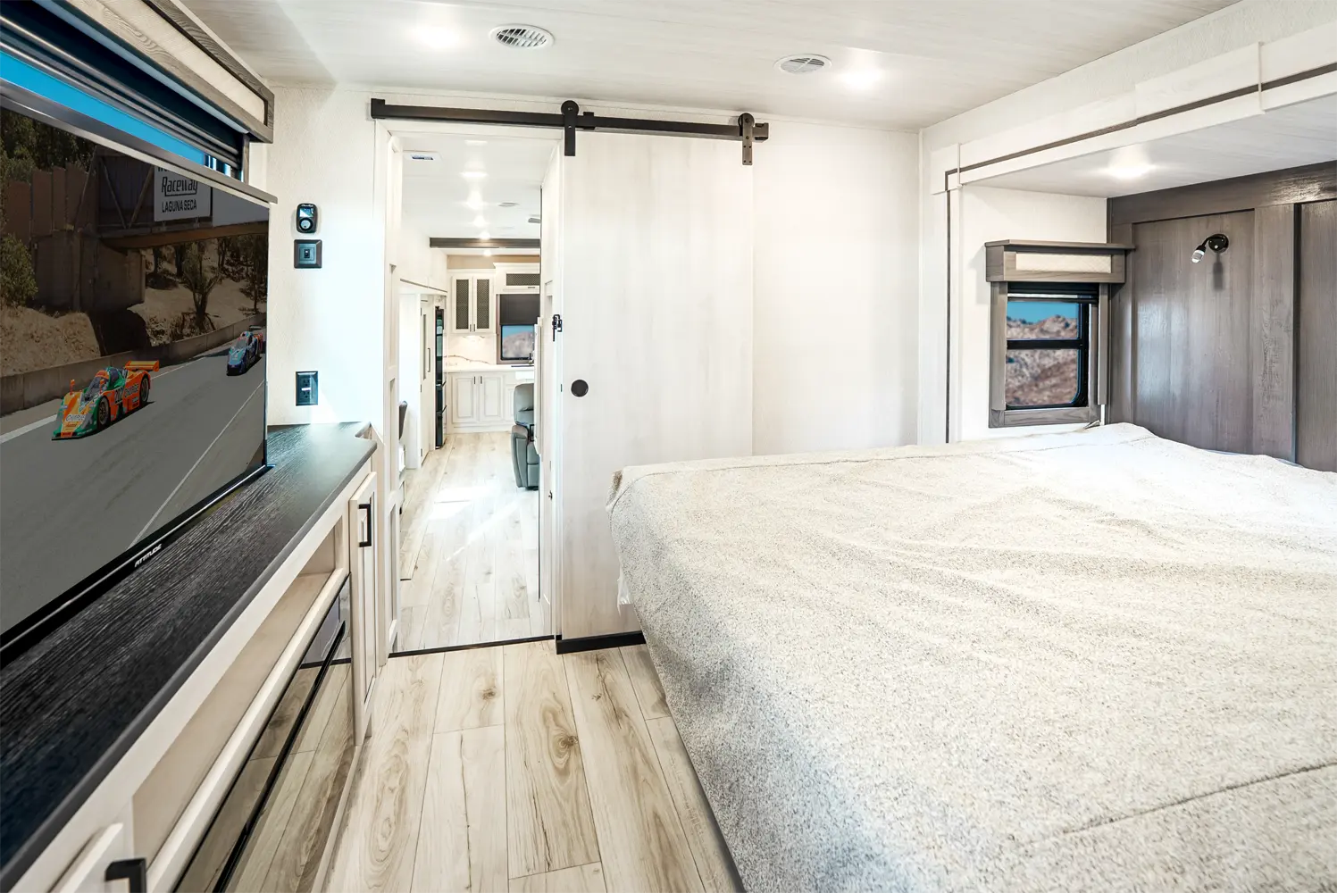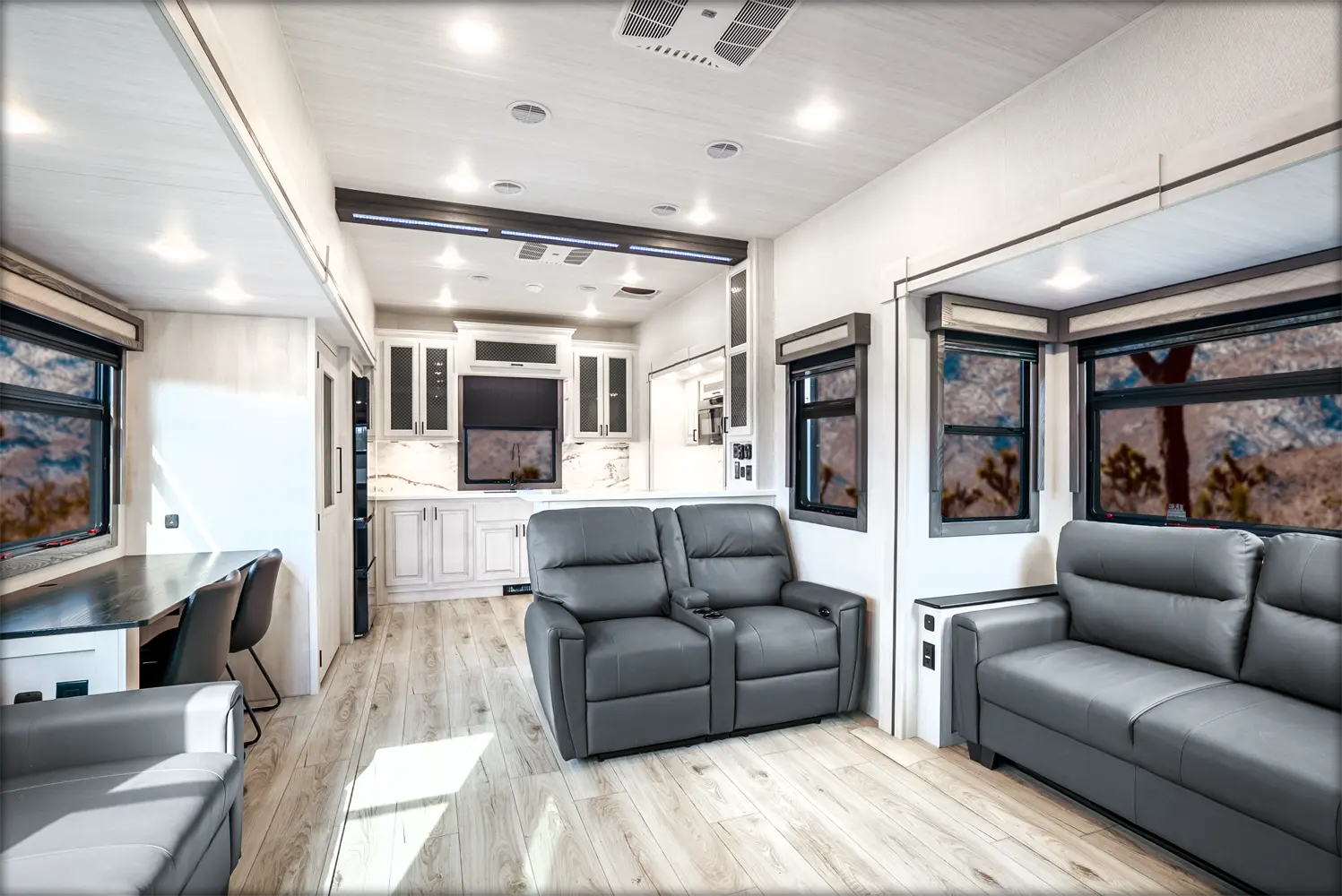 The Ahara 395FB floorplan has one entry and four slide outs. Exterior features include: fiberglass exterior and 16' & 18' awning. Interiors features include: rear kitchen and bathroom and a half.