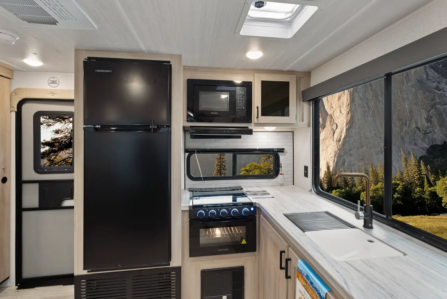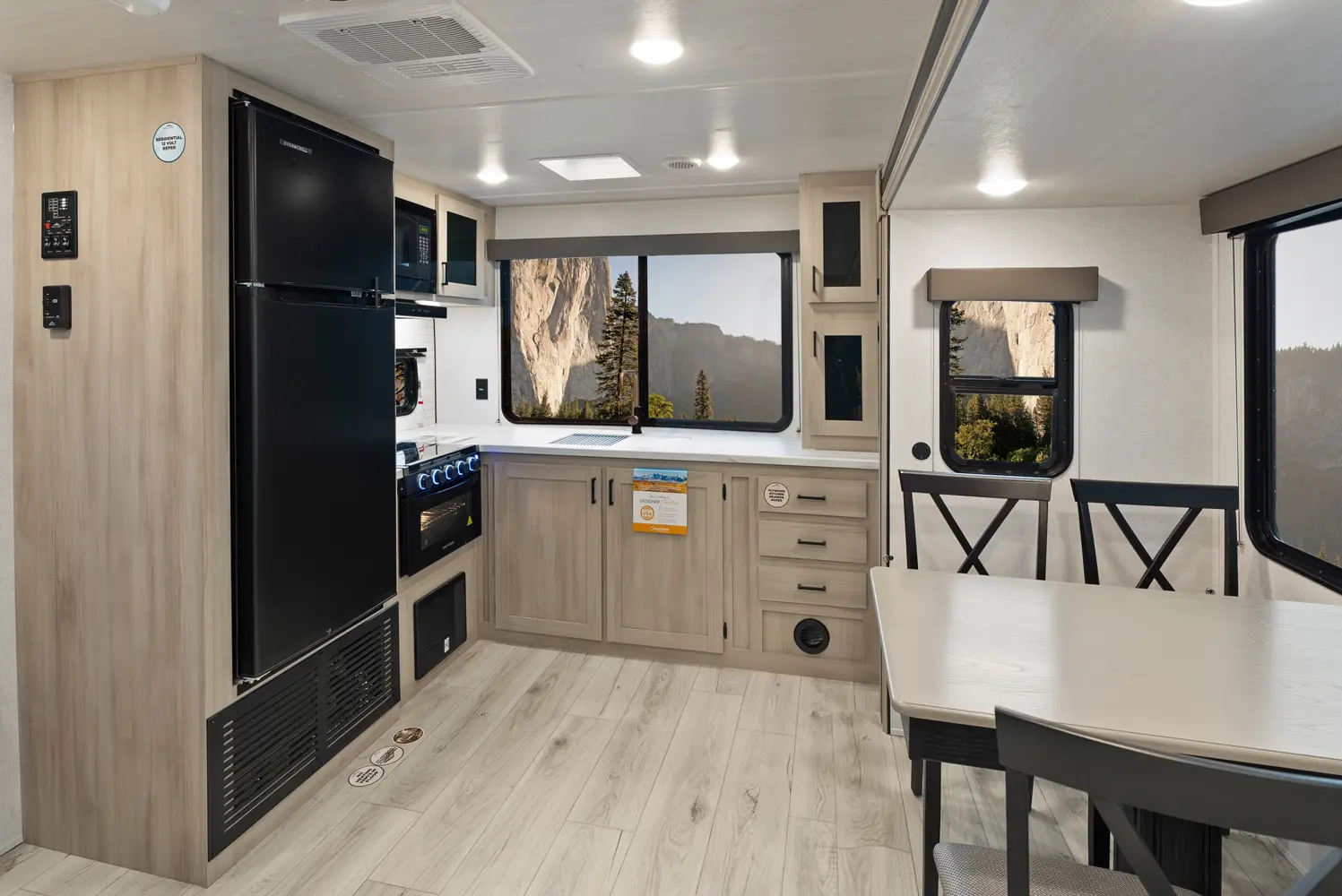 The Della Terra 263RK floorplan has two entries and two slide outs. Exterior features include: metal exterior and 20' awning. Interiors features include: rear kitchen and front bedroom.