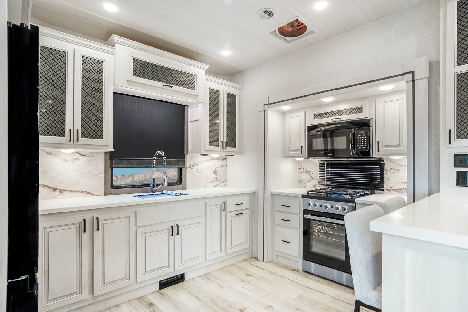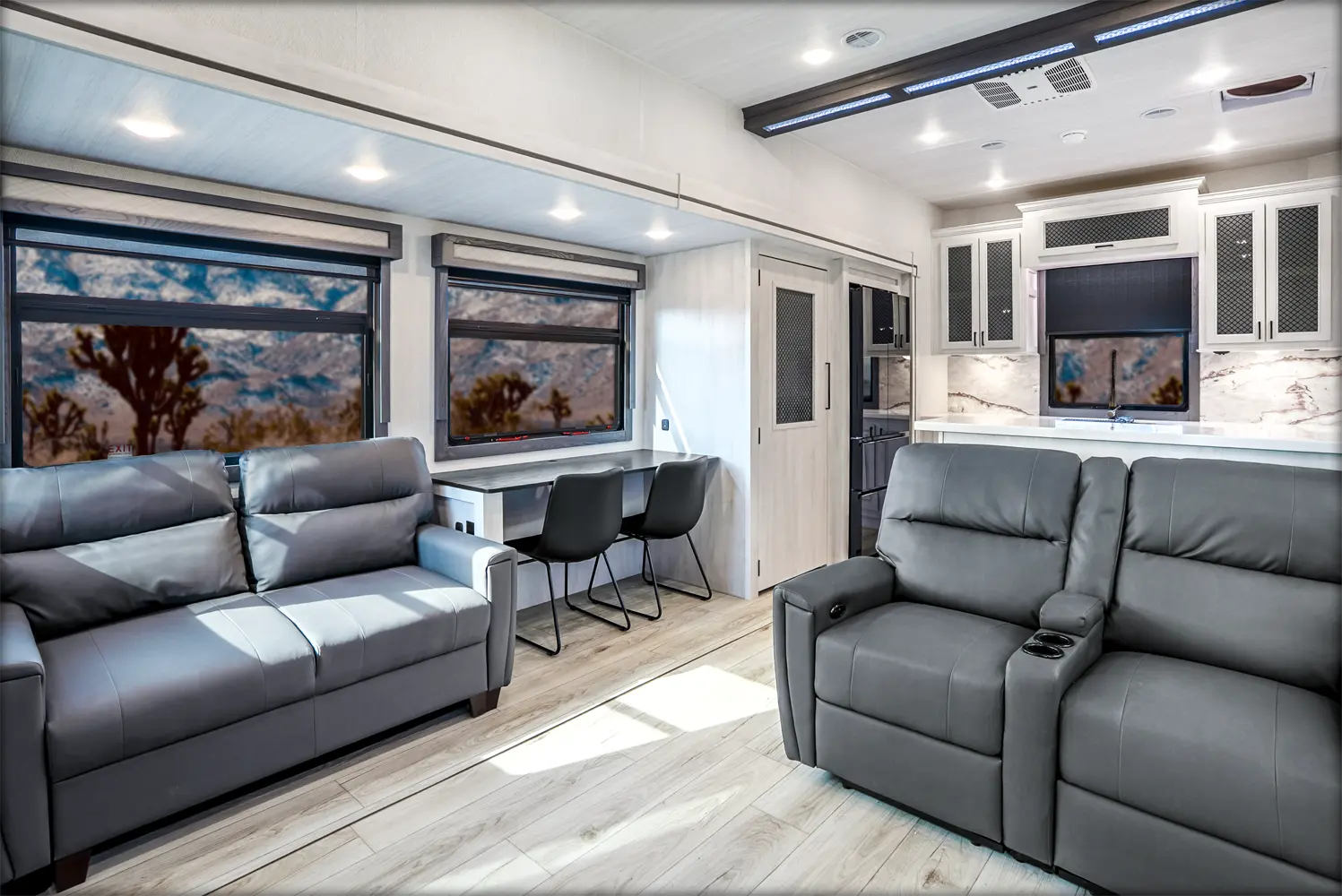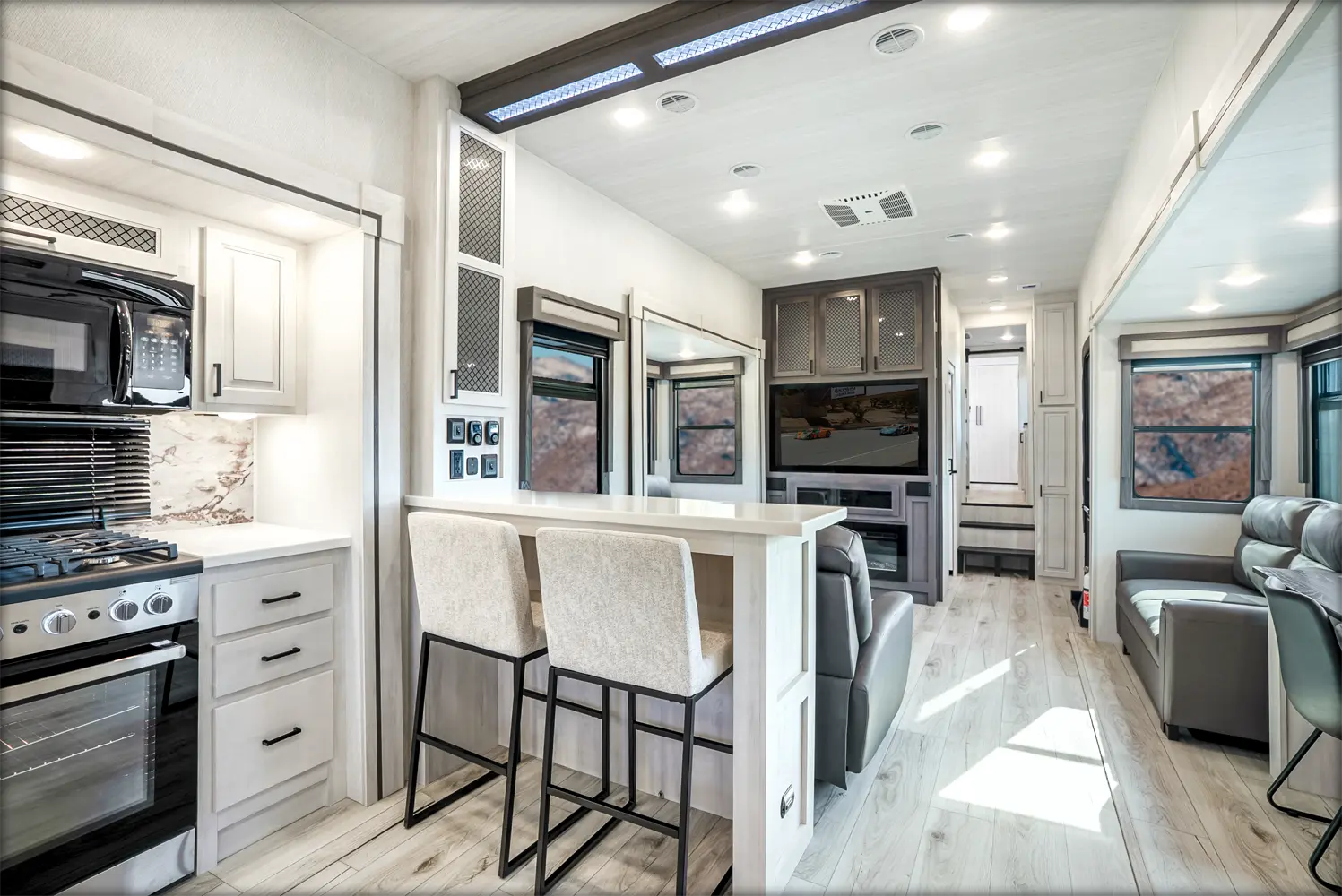 The Ahara 395FB floorplan has one entry and four slide outs. Exterior features include: fiberglass exterior and 16' & 18' awning. Interiors features include: rear kitchen and bathroom and a half.
