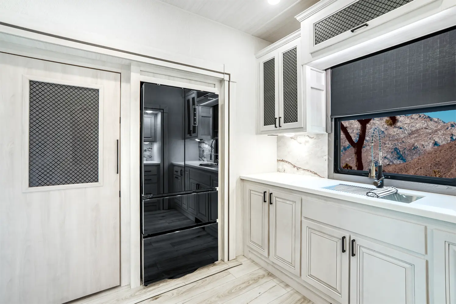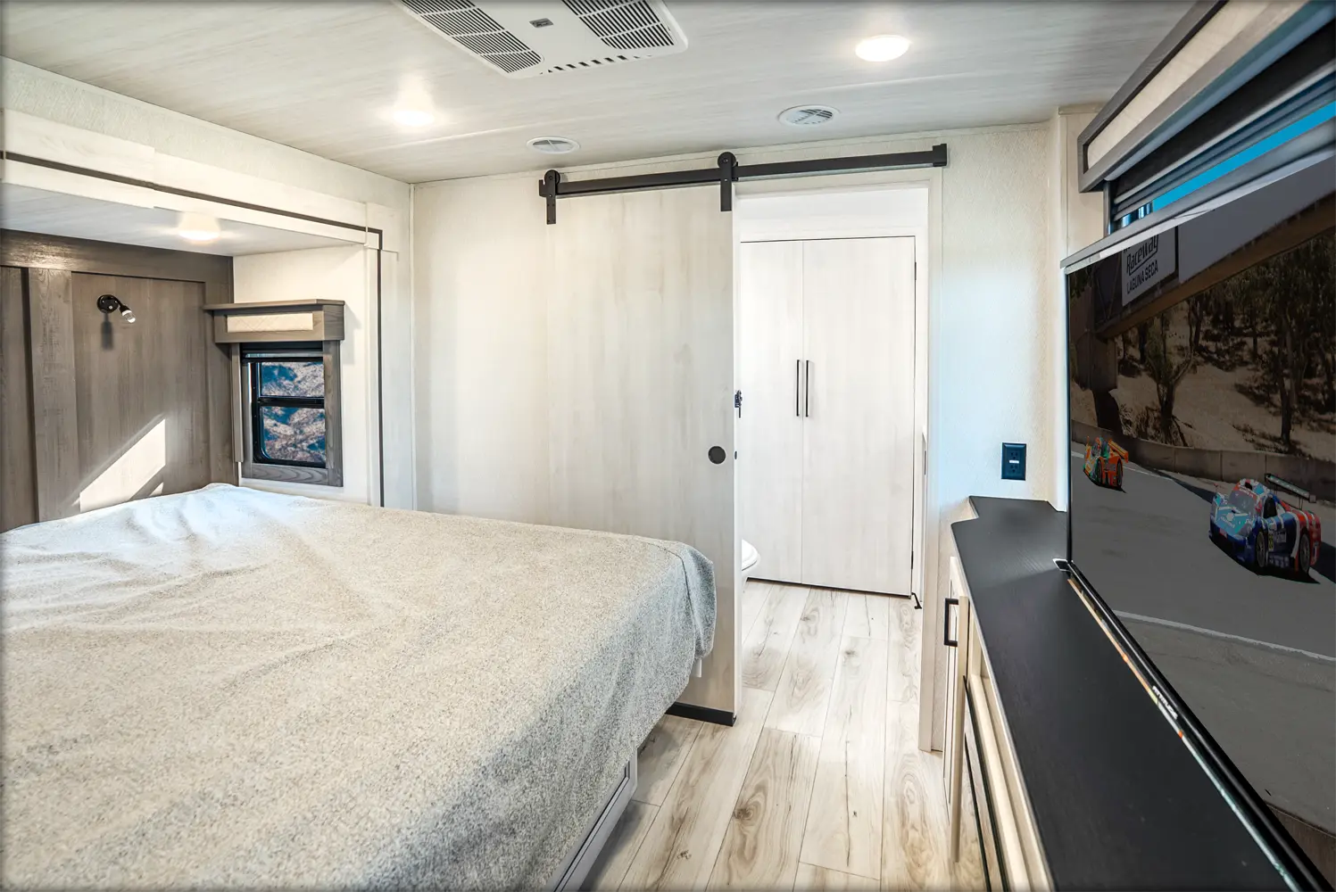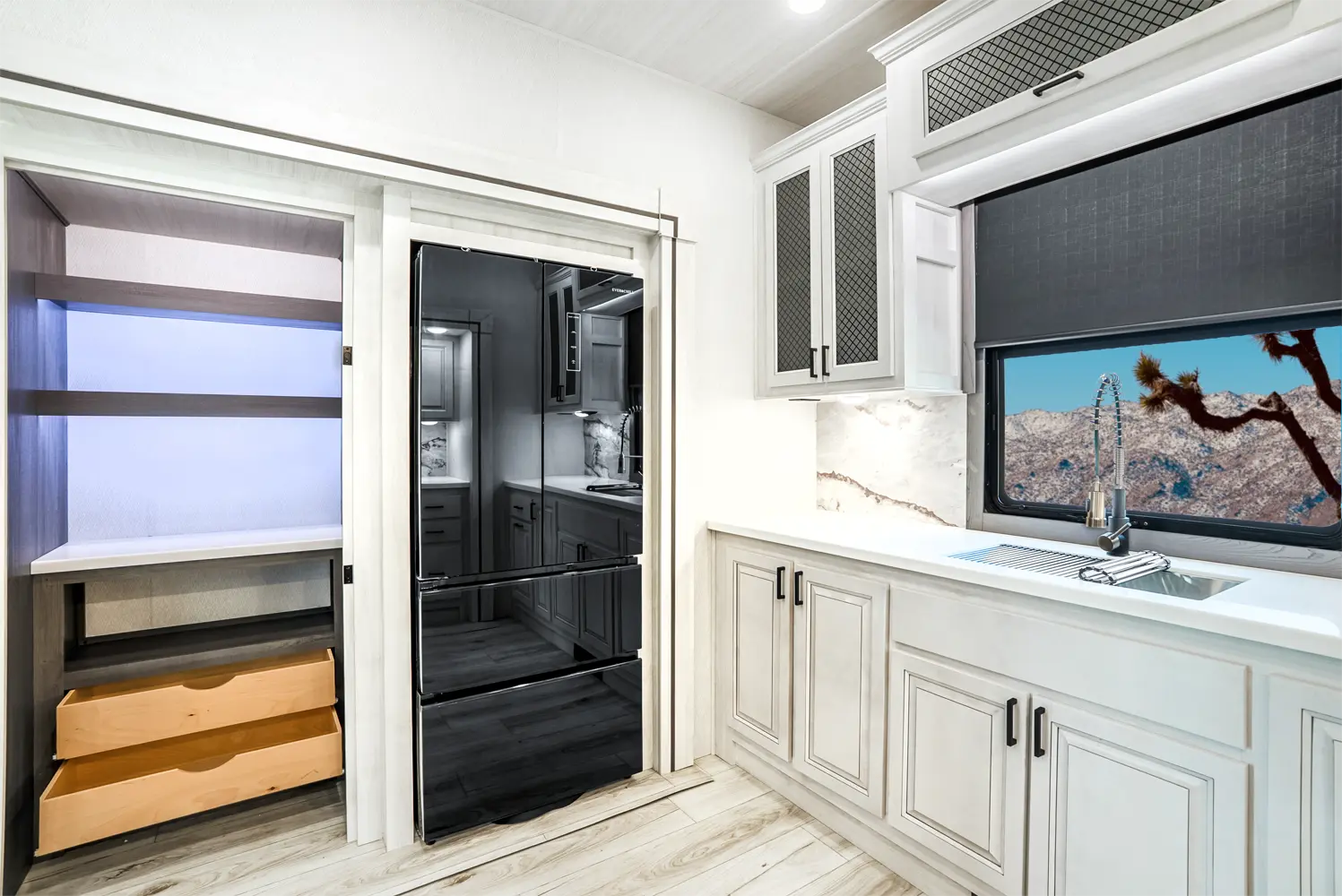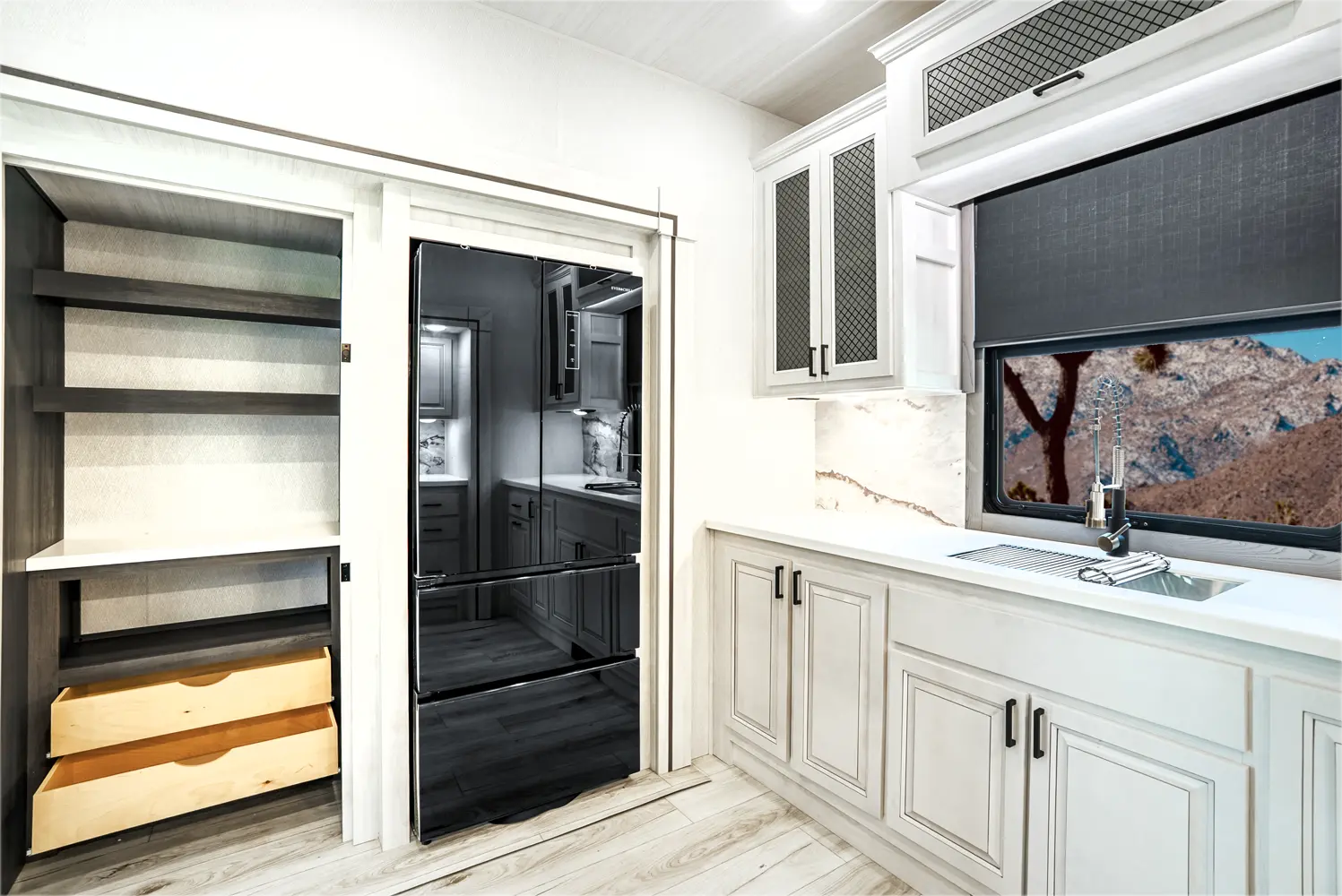 The Ahara 395FB floorplan has one entry and four slide outs. Exterior features include: fiberglass exterior and 16' & 18' awning. Interiors features include: rear kitchen and bathroom and a half.