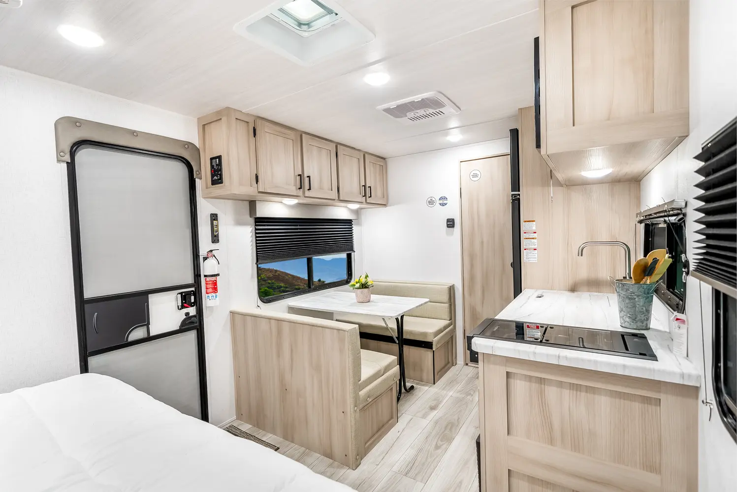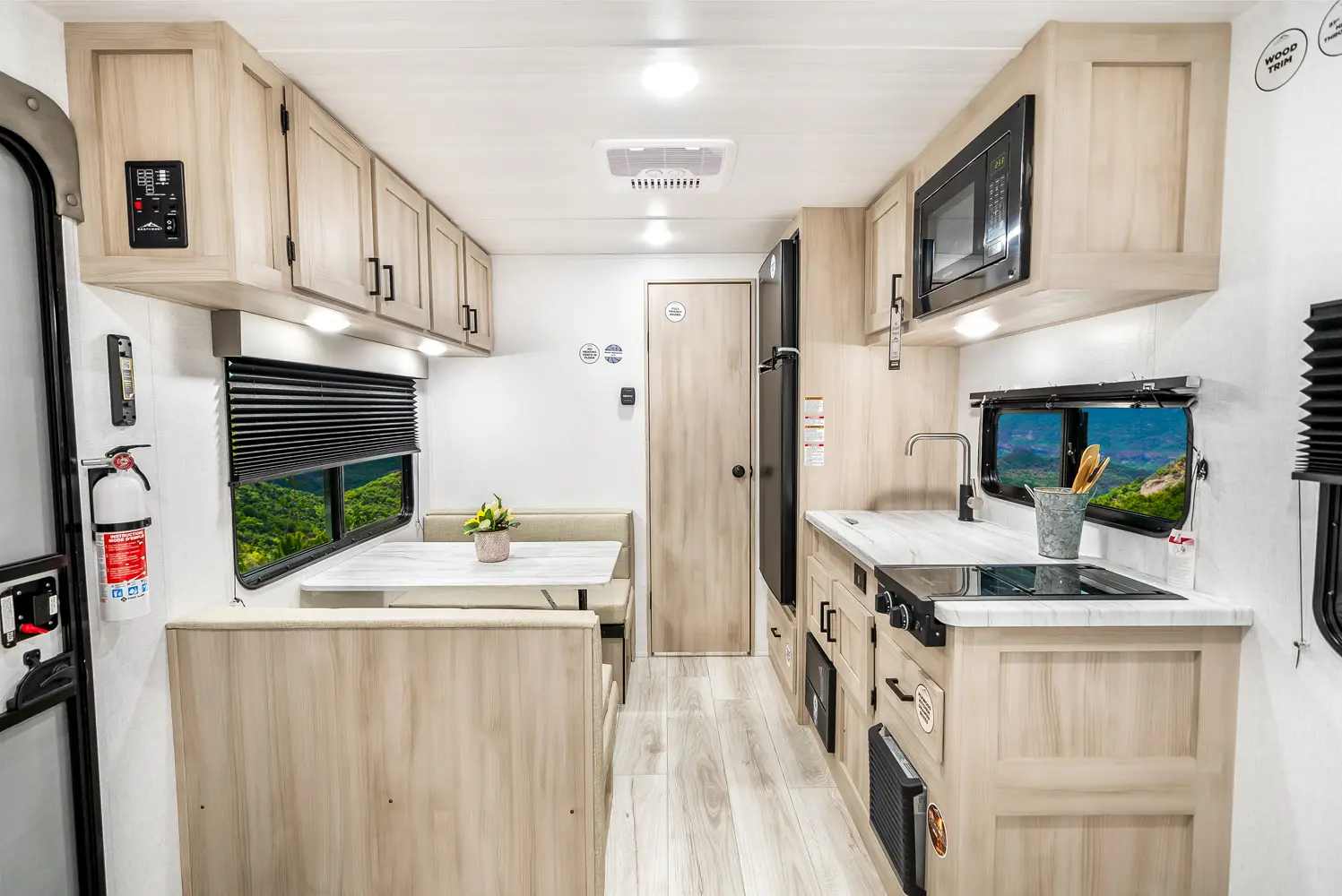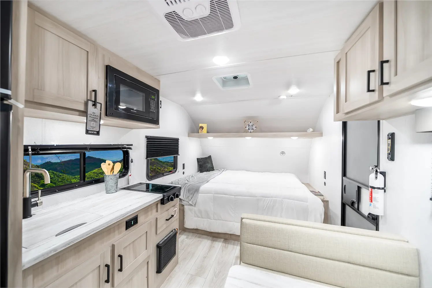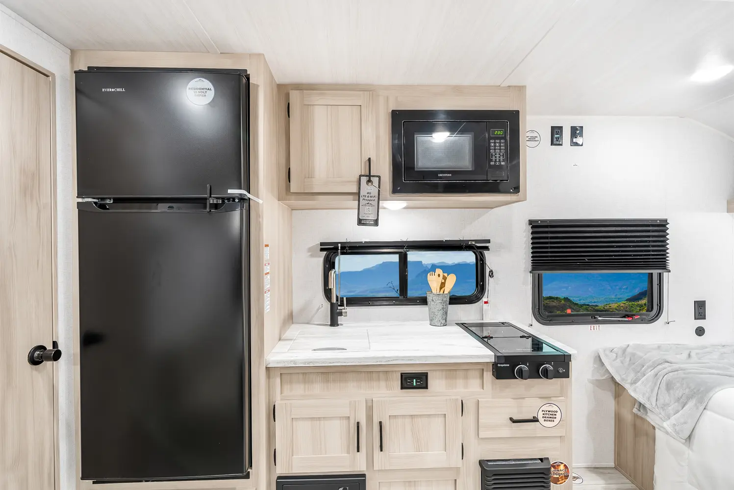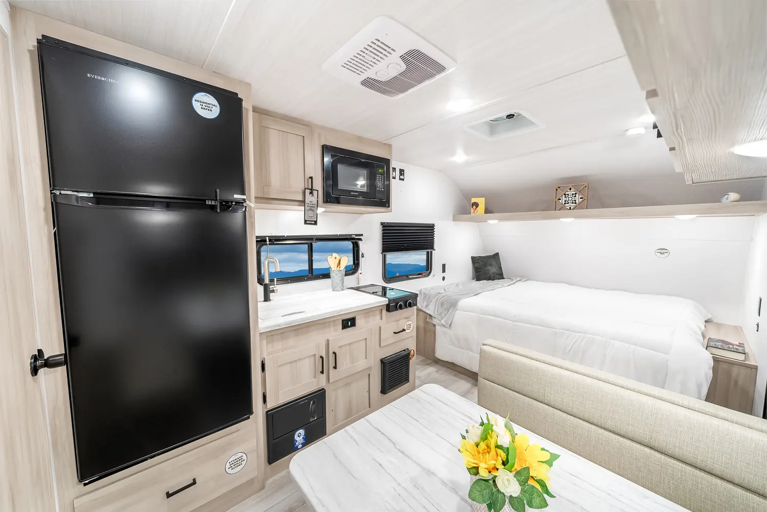 The Della Terra 160RBXLE floorplan has one entry and zero slide outs. Exterior features include: metal exterior and 12' awning. Interiors features include: front bedroom and rear bathroom.