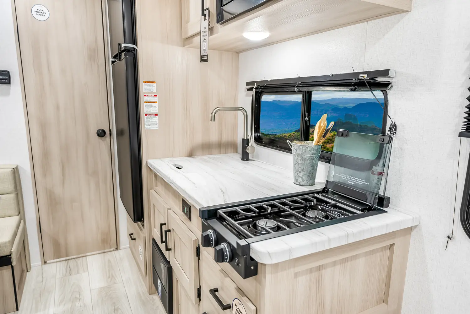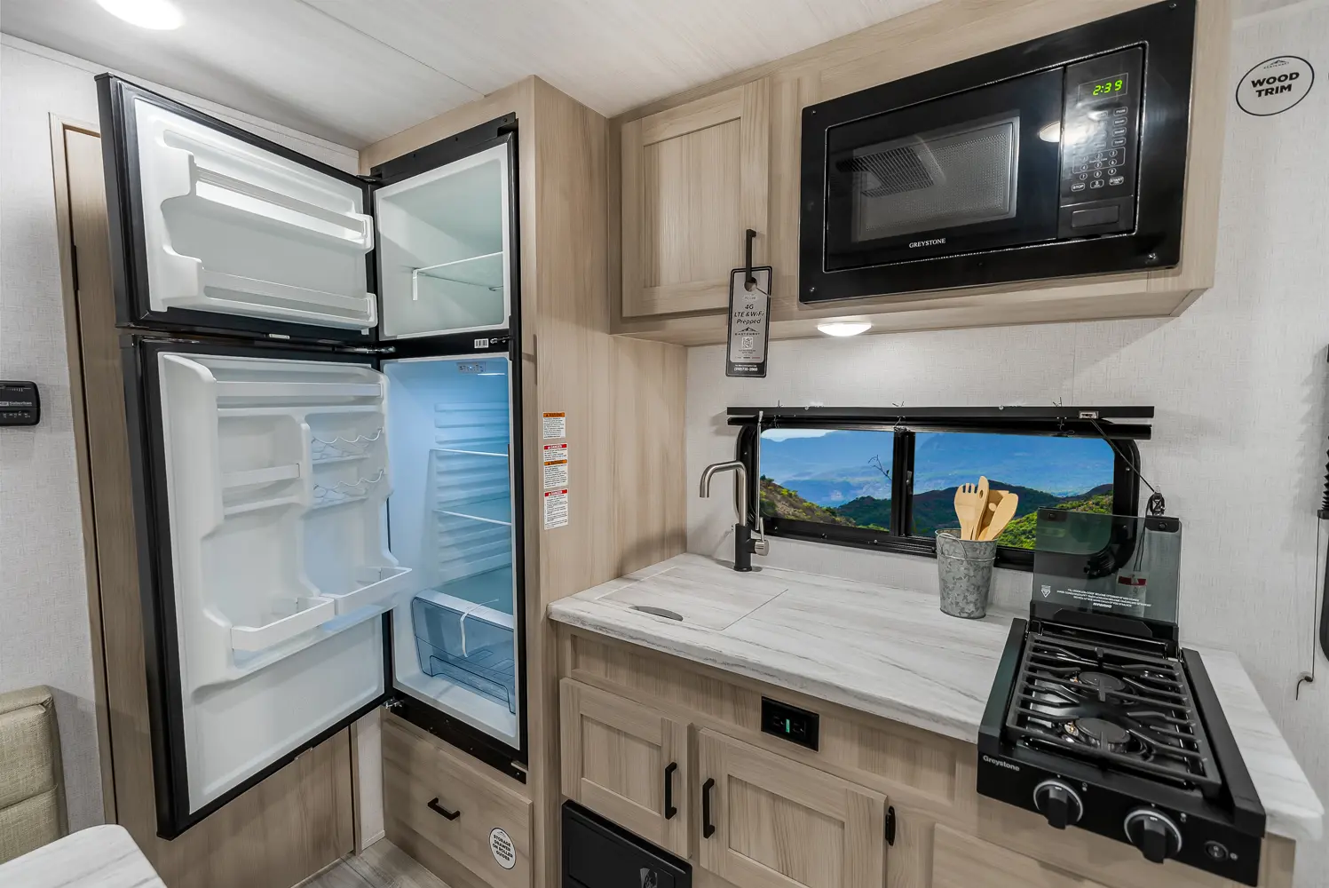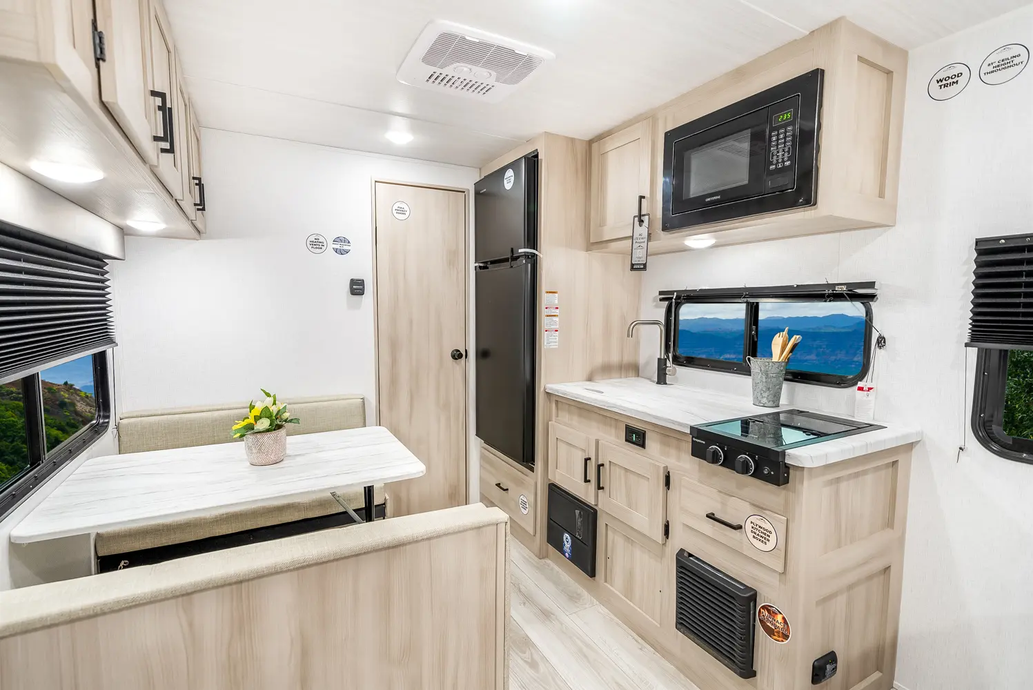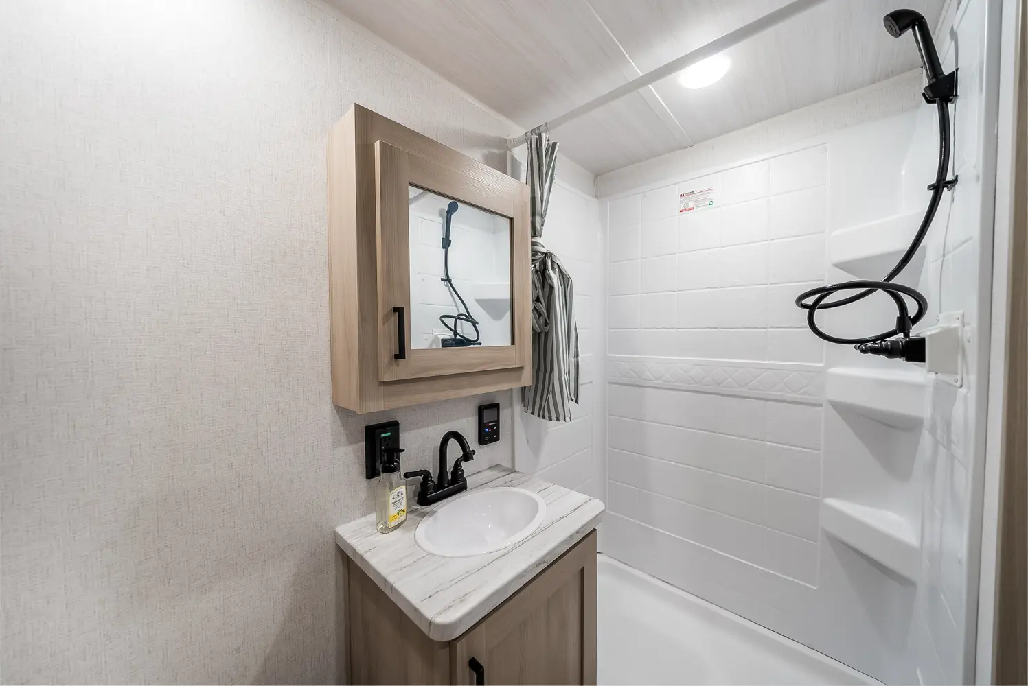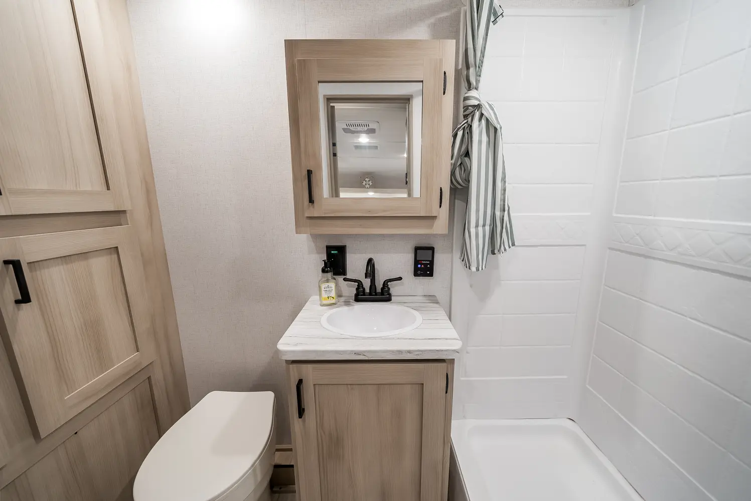 The Della Terra 160RBXLE floorplan has one entry and zero slide outs. Exterior features include: metal exterior and 12' awning. Interiors features include: front bedroom and rear bathroom.