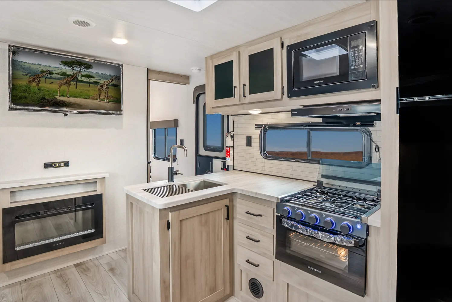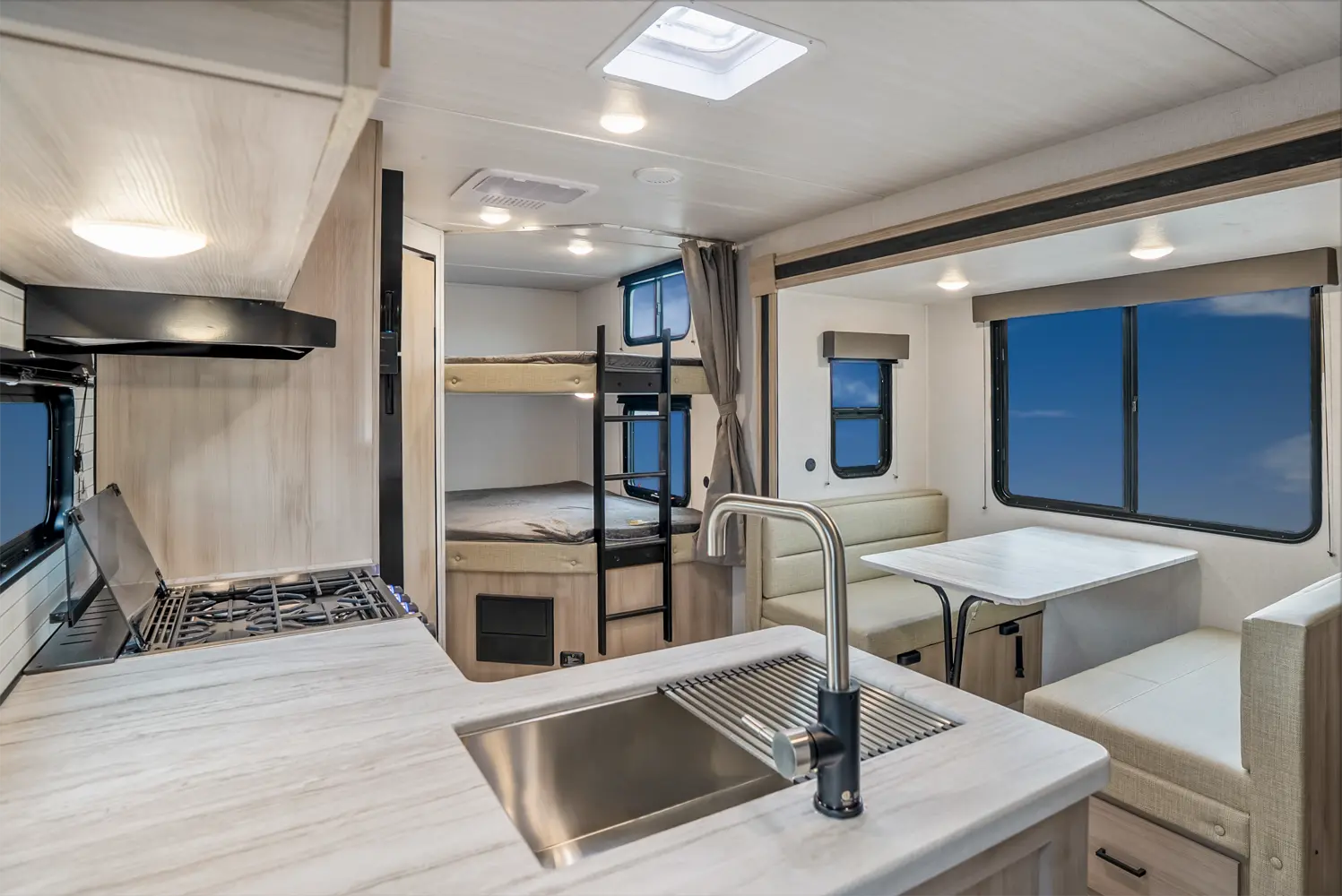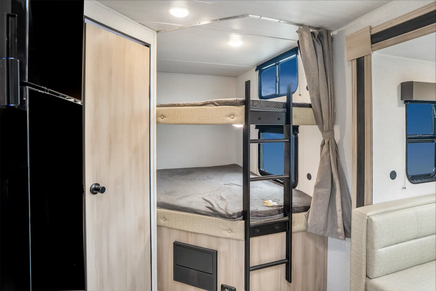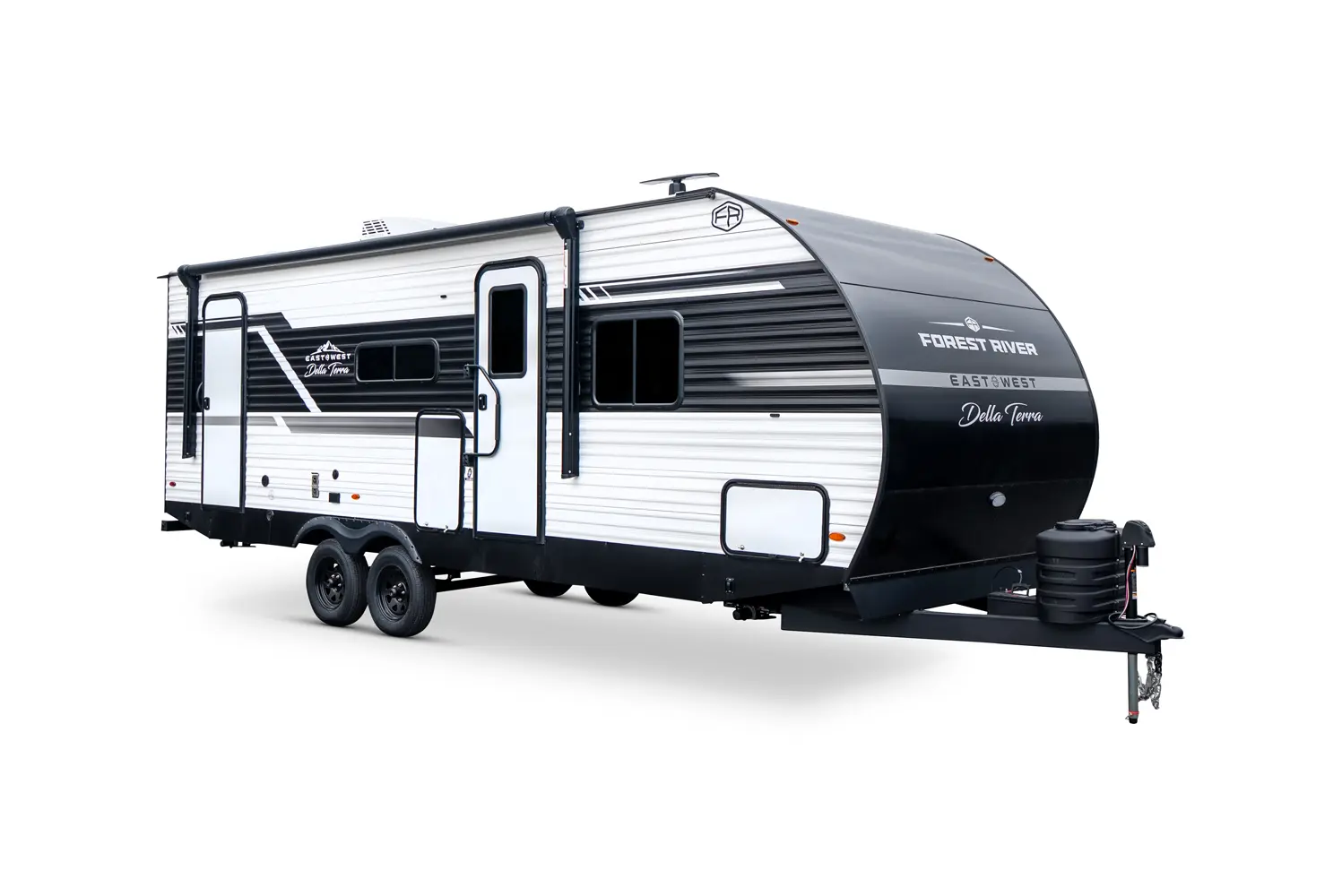 The Della Terra 241BH floorplan has two entries and one slide out. Exterior features include: metal exterior, 16' awning and outside kitchen. Interiors features include: bunk beds and front bedroom.