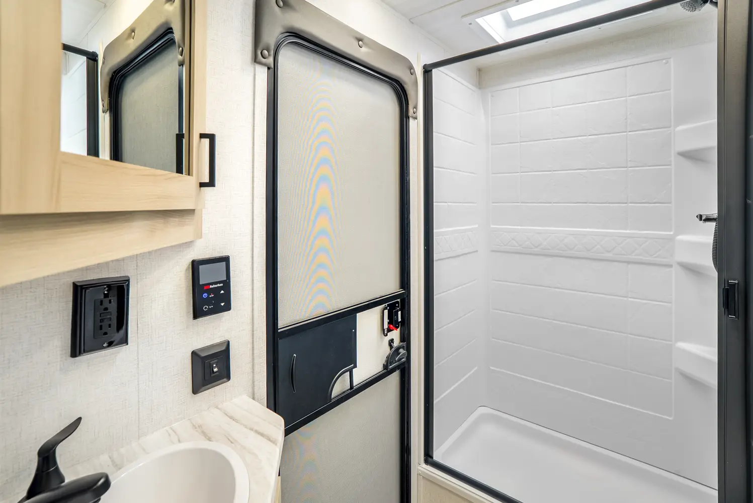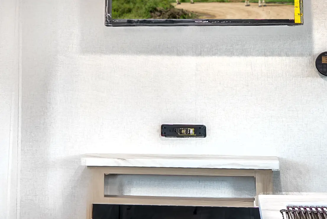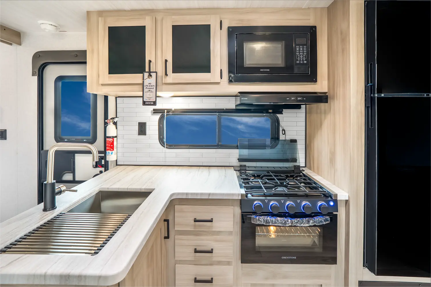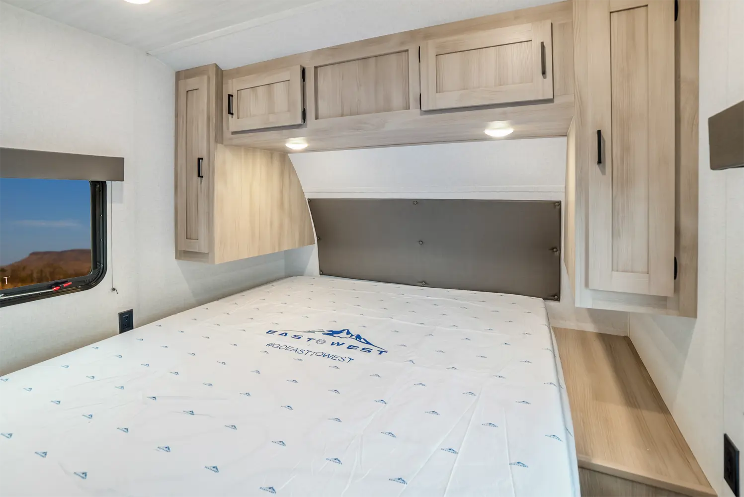 The Della Terra 241BH floorplan has two entries and one slide out. Exterior features include: metal exterior, 16' awning and outside kitchen. Interiors features include: bunk beds and front bedroom.